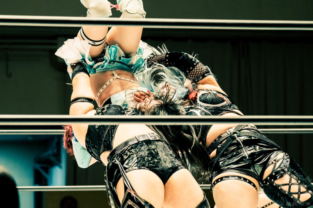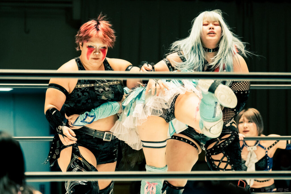 星来芽依とスターライト・キッドのダブルドロップキックを受ける…