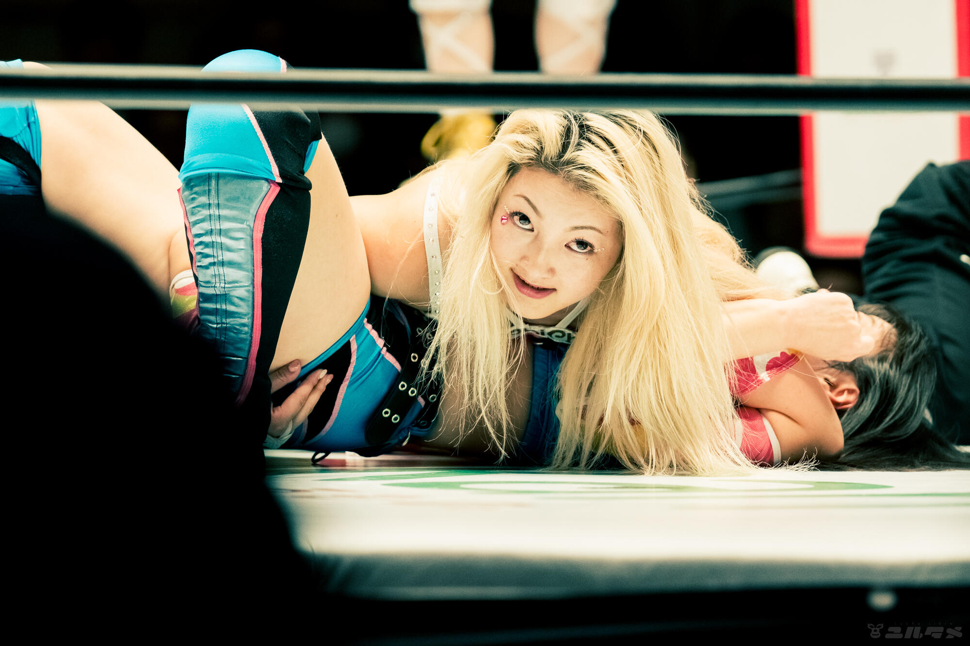 八神蘭奈のドロップキックを胸で受ける玖麗さやか